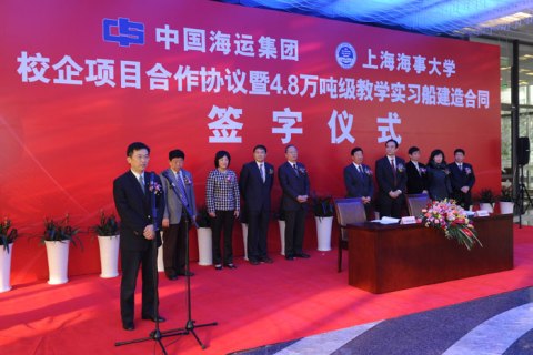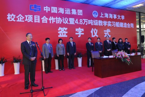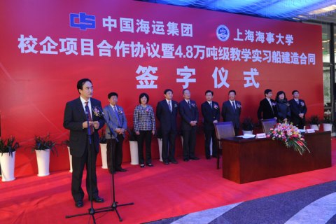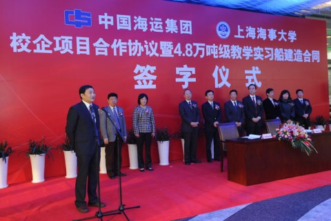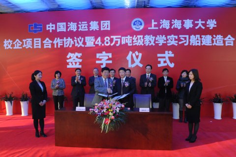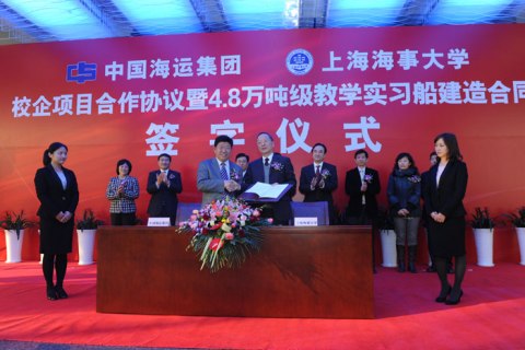 On the afternoon of December 16, Shanghai Maritime University and China Shipping Group signed a cooperative agreement on deepening collaboration between the two sides, particularly on building a new training ship of 48,000 gross tons.