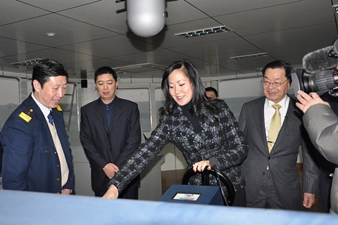 The guests visited the Mulan Maritime Simulation Memorial Center, where they talked over with the students who were attending the navigation simulator and marine engine simulator courses. Later on, the guests went to the office of the Shanghai Mulan Education Foundation and dedicated a bouquet of roses to the portrait of the deceased Ms. Mulan Chu Chao, the wife of Dr. Chao.