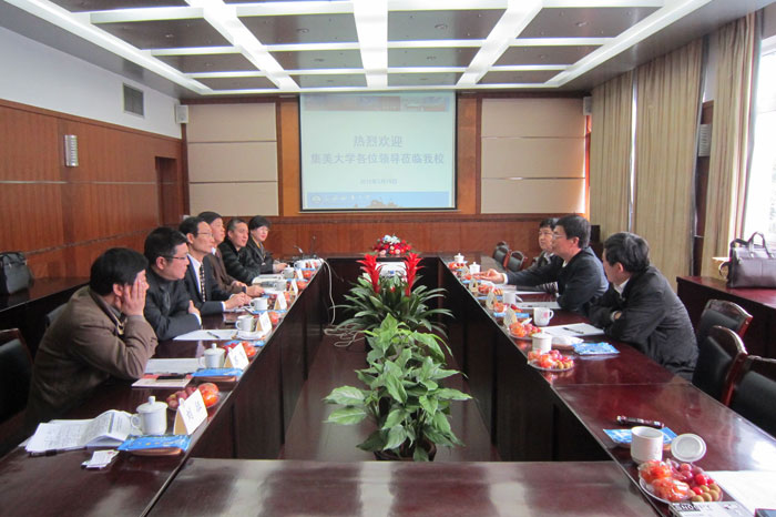 Prof. Huang Youfang delivered a welcome speech. He and other leaders of SMU introduced to the guests the teaching development, scientific research and discipline constructions etc. of SMU. Prof. Su Wenjin, President of Jimei University gave an introduction to the history, mission, features, disciplines, teaching, scientific research and development planning of the Jimei University. Both sides have reached the consensus that they should share resources, promote cooperation and seek for a win-win result.