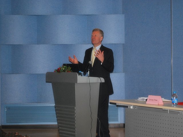 Prof. Huang Youfang, President of SMU delivered the welcoming speech. Then he awarded the appointment letter to Mr. Jeremy Penn, CEO of the Baltic Exchange, helped him wear the school badge and gave him gifts.