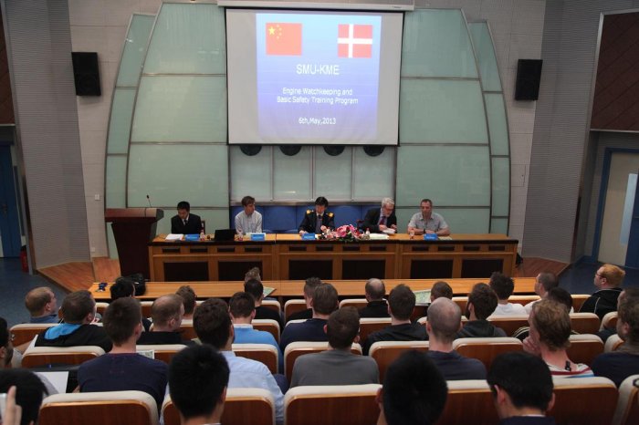 On May 6, the opening ceremony of the 3rd Danish Class for Engine Watchkeeping and Basic Safety Training Program was held at SMU. Mr. Jan Runge, Professor of Danish Copenhagen Marine Engineer College, together with the other two teachers and 30 students from Copenhagen Marine Engineer College, relative leaders of Merchant Marine College and International Education College of SMU, training teachers and student volunteers attended the ceremony.