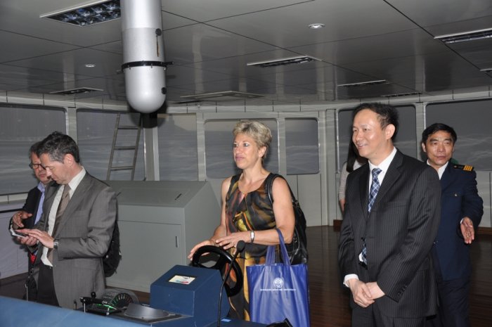 During the visit, Mrs. Cathy Buggenhout, accompanied by Prof. Jin Yongxing toured Maritime Simulation Center and the COSTAMARE Engine Room Integrated Laboratory. She also admired and appreciated SMU teachers for their abilities of independent scientific research.