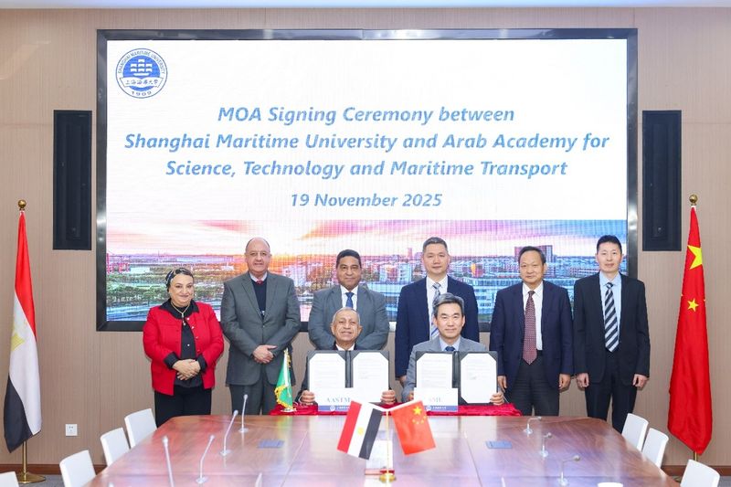 On November 19, a delegation led by Prof. Dr. Ismail Abdel Ghafar Ismail Farag, President of the Arab Academy for Science, Technology and Maritime Transport (AASTMT), visited Shanghai Maritime University (SMU). SMU President Chu Beiping and Vice President Yin Ming met with the delegation. Representatives from relevant departments and colleges of SMU, including the International Office, the University President's Office, and the Merchant Marine College, participated in the meeting.